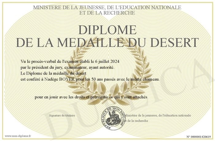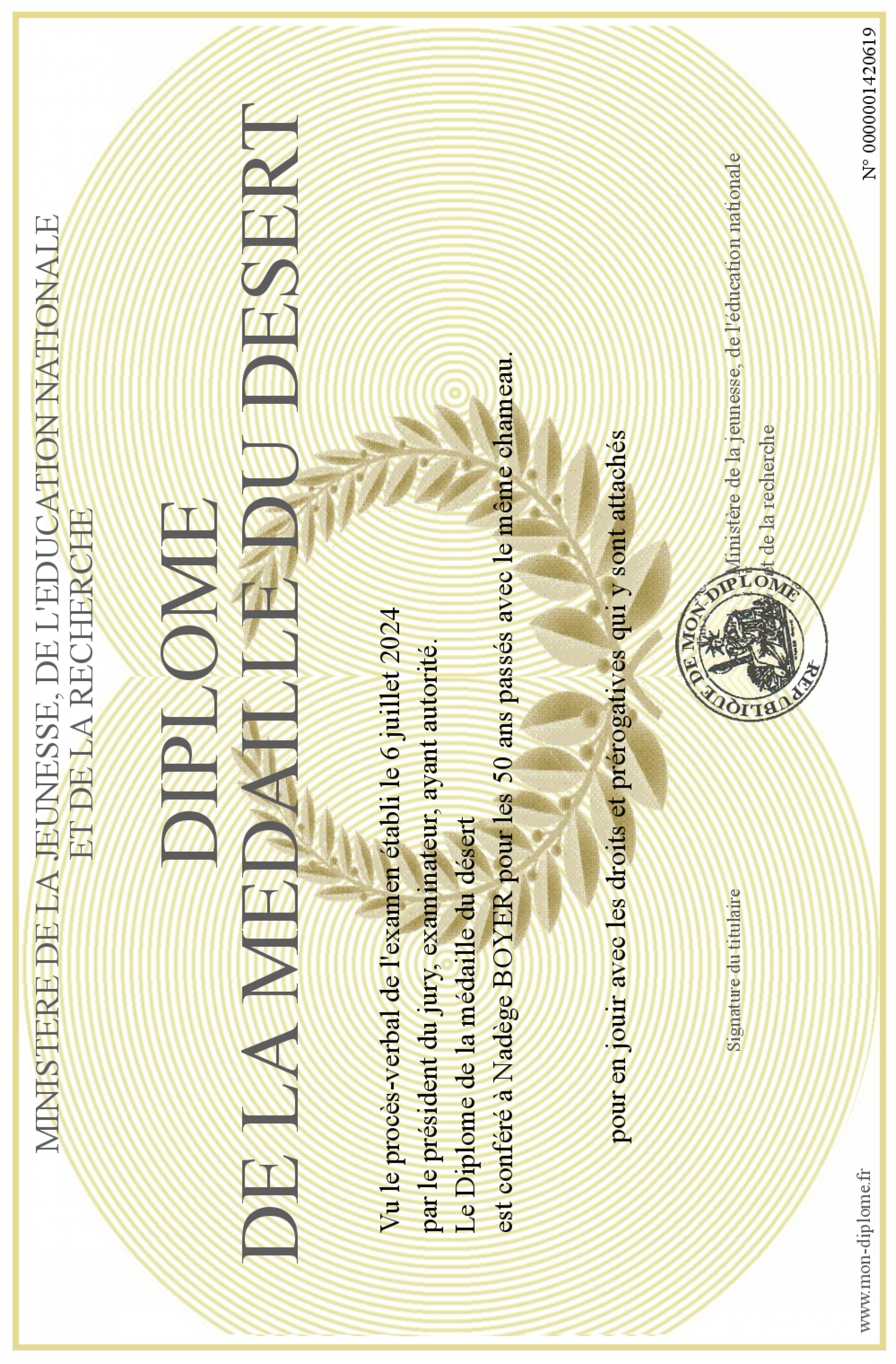 Envoyez par email votre Diplôme de la médaille du désert personalisé