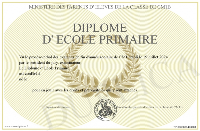 Envoyez par email votre Diplôme d' Ecole Primaire personalisé