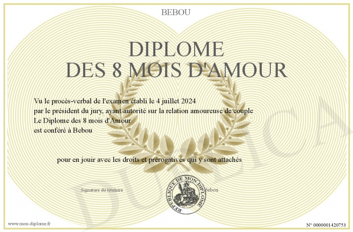 Envoyez par email votre Diplôme des 8 mois d'Amour personalisé