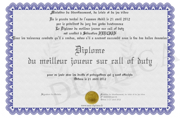 Envoyez par email votre Diplôme du meilleur joueur sur call of duty personalisé