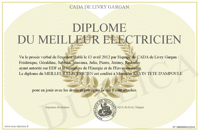 Envoyez par email votre Diplôme du meilleur électricien personalisé