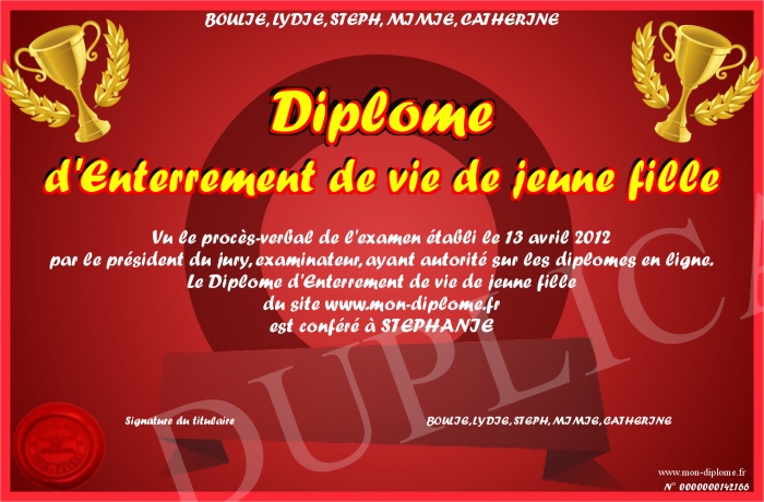 Envoyez par email votre Diplome d'Enterrement de vie de jeune fille personalisé