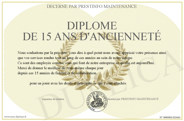 Envoyez par email votre DIPLOME DE 15 ANS D'ANCIENNETÉ personalisé