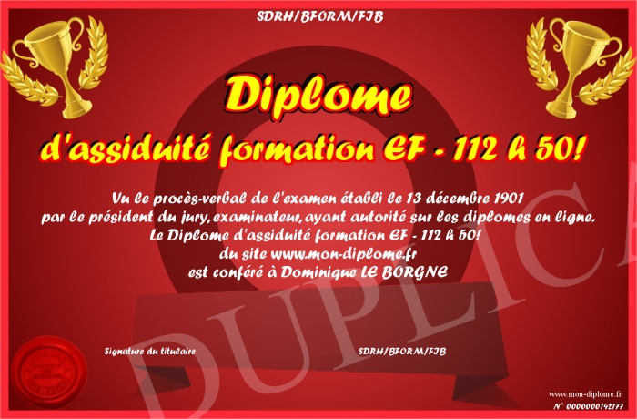 Envoyez par email votre Diplôme d'assiduité formation EF - 112 h 50! personalisé