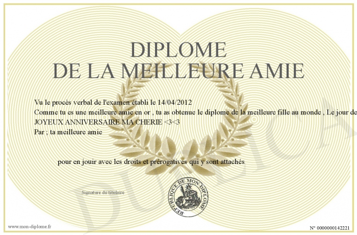 Envoyez par email votre Diplôme de la meilleure amie personalisé