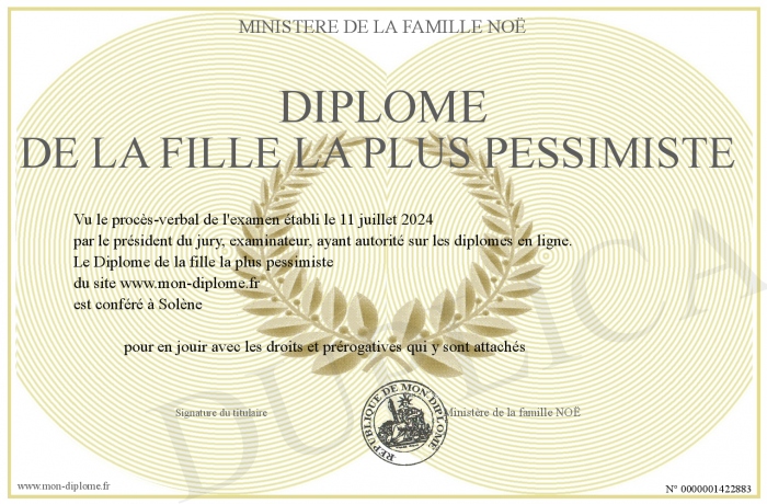 Envoyez par email votre Diplôme de la fille la plus pessimiste personalisé
