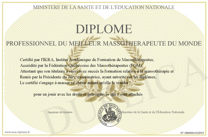 Envoyez par email votre Diplôme Professionnel du Meilleur Massothérapeute du Monde personalisé