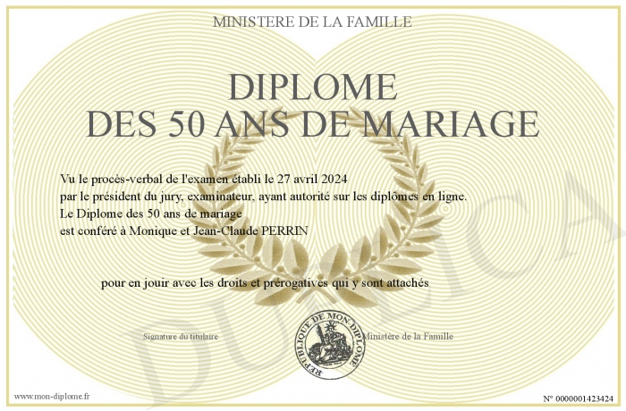 Envoyez par email votre Diplôme des 50 ans de mariage personalisé