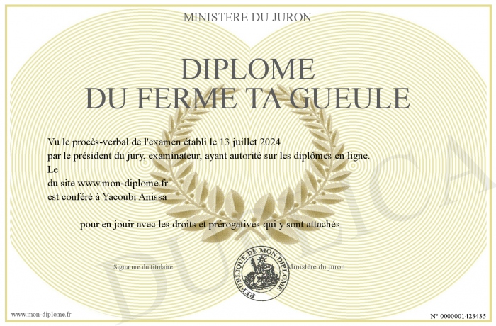 Envoyez par email votre Diplôme du Ferme ta gueule personalisé