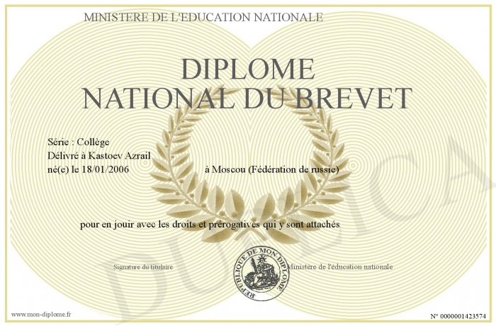 Envoyez par email votre Diplôme national du Brevet personalisé
