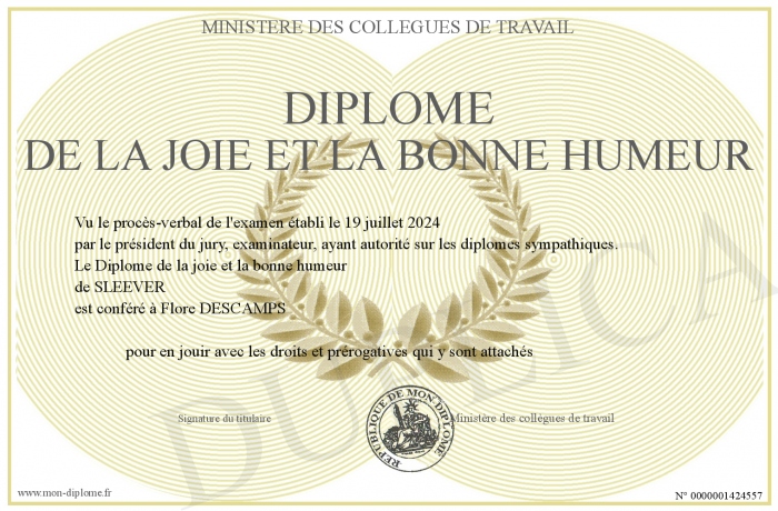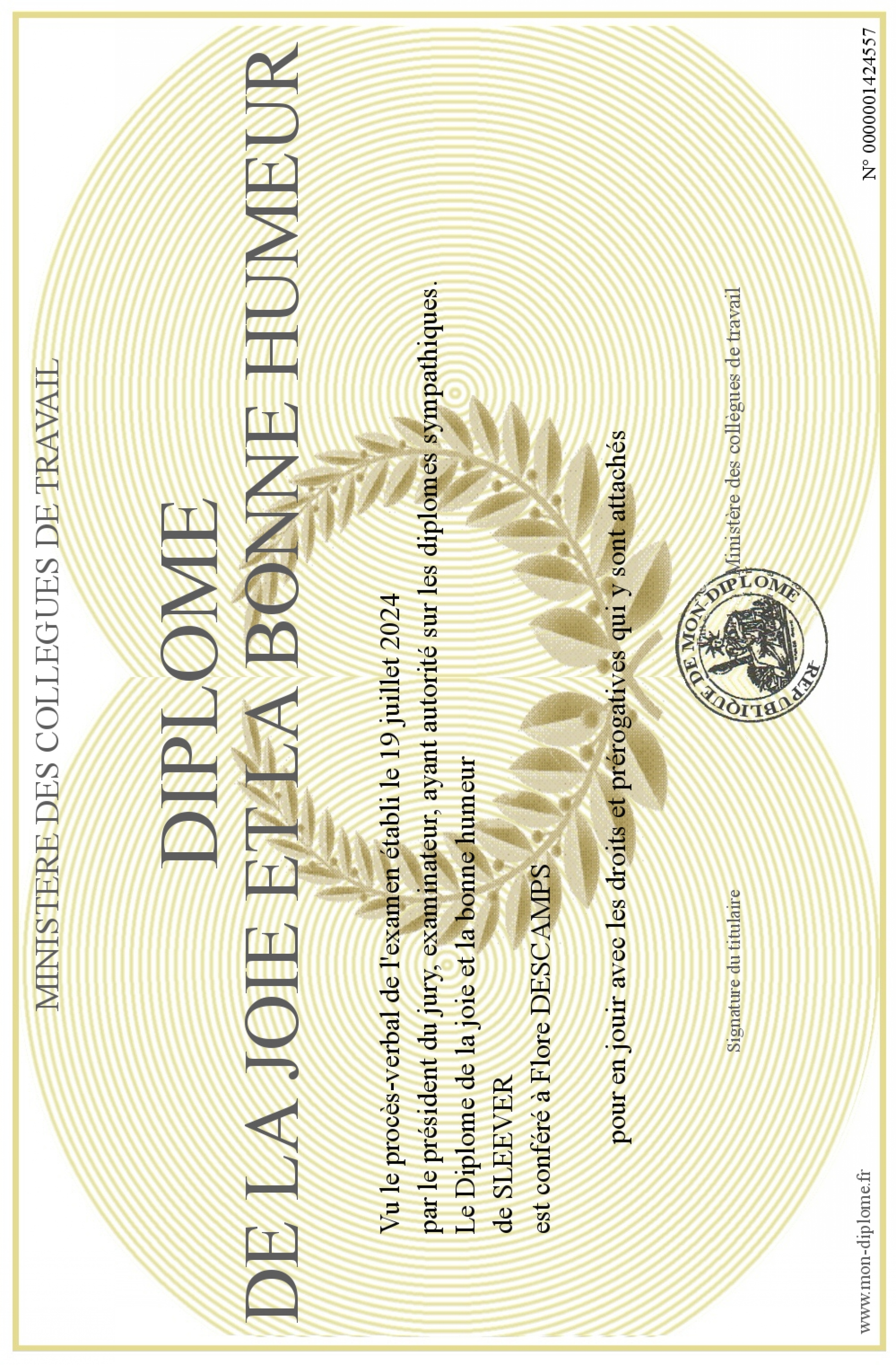 Envoyez par email votre Diplôme de la joie et la bonne humeur personalisé