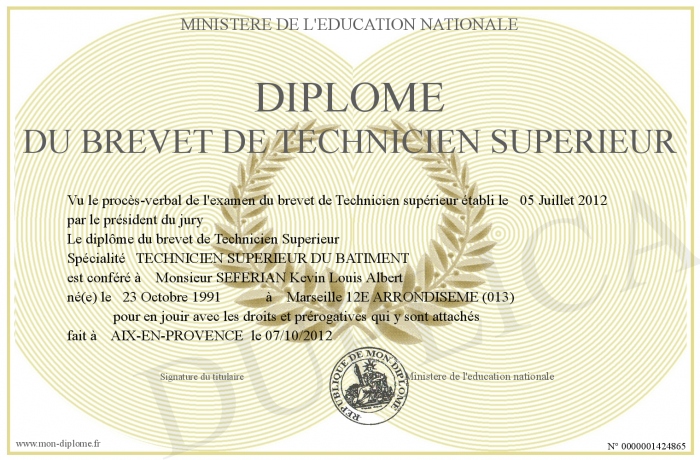 Envoyez par email votre Diplôme du Brevet de Technicien Superieur personalisé