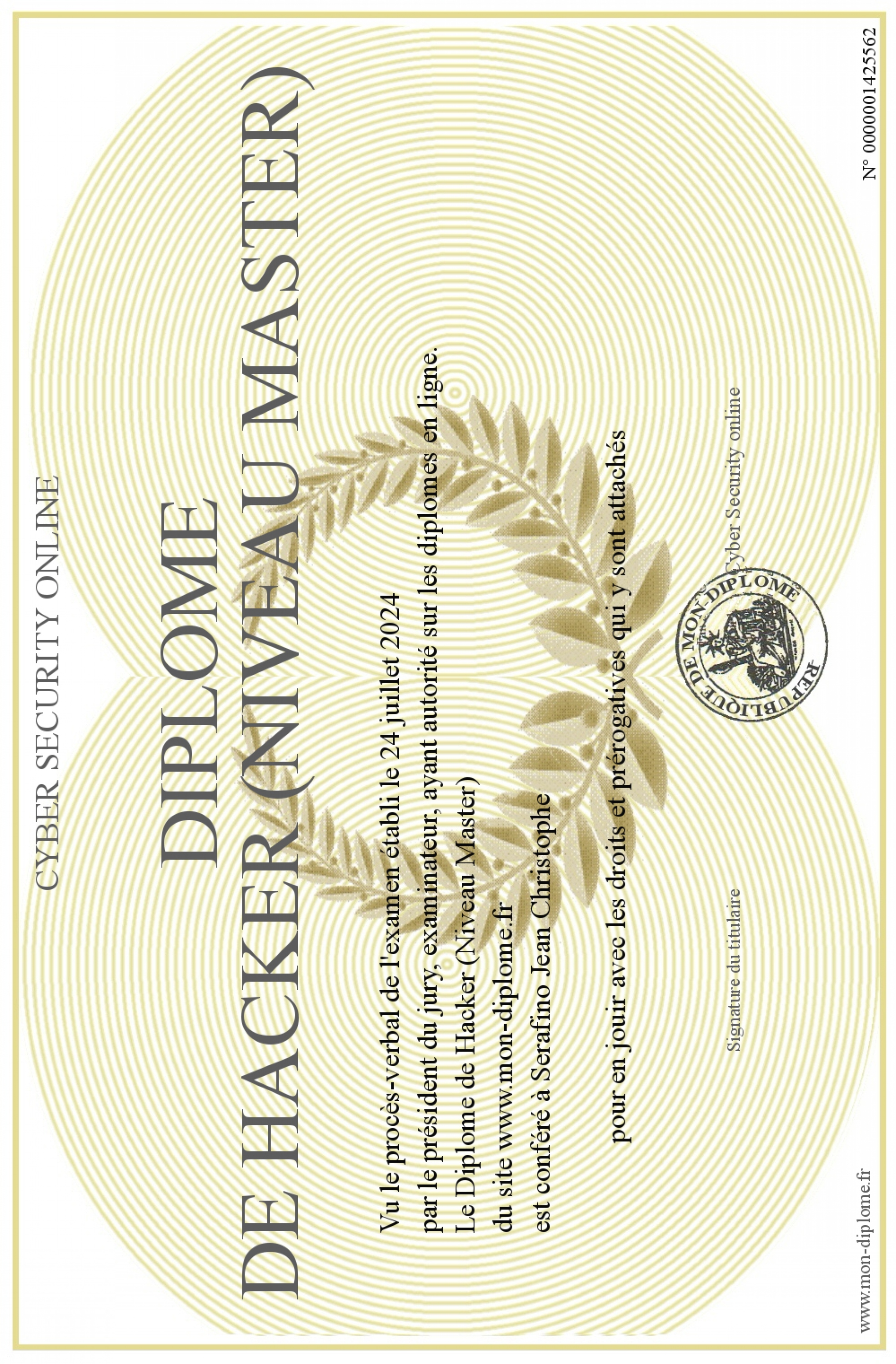 Envoyez par email votre Diplôme de Hacker (Niveau Master) personalisé