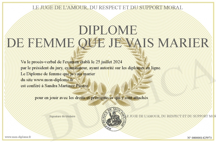 Envoyez par email votre Diplôme de femme que je vais marier personalisé