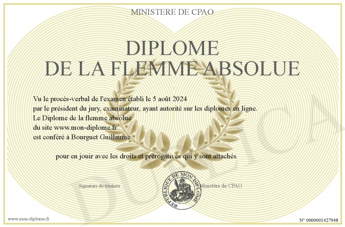 Envoyez par email votre Diplôme de la flemme absolue personalisé
