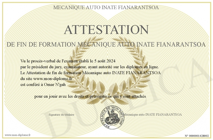 Envoyez par email votre Attestation de fin de formation Mécanique auto INATE FIANARANTSOA personalisé
