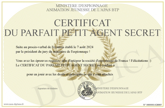 Envoyez par email votre CERTIFICAT DU PARFAIT PETIT AGENT SECRET personalisé
