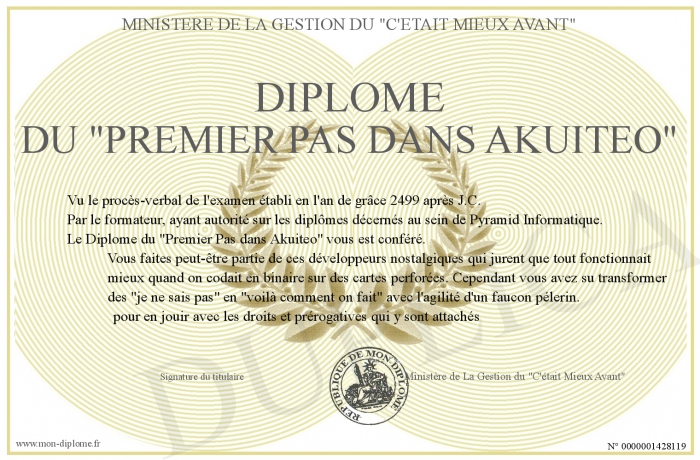 Envoyez par email votre Diplôme du -Premier Pas dans Akuiteo- personalisé