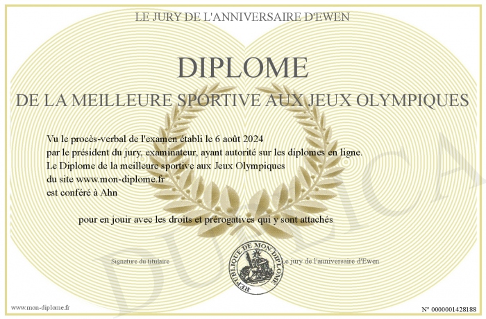 Envoyez par email votre Diplôme de la meilleure sportive aux Jeux Olympiques personalisé