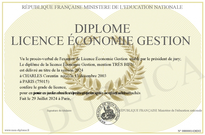Envoyez par email votre Diplôme Licence ÉCONOMIE GESTION personalisé