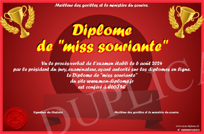 Envoyez par email votre Diplôme de -miss souriante- personalisé