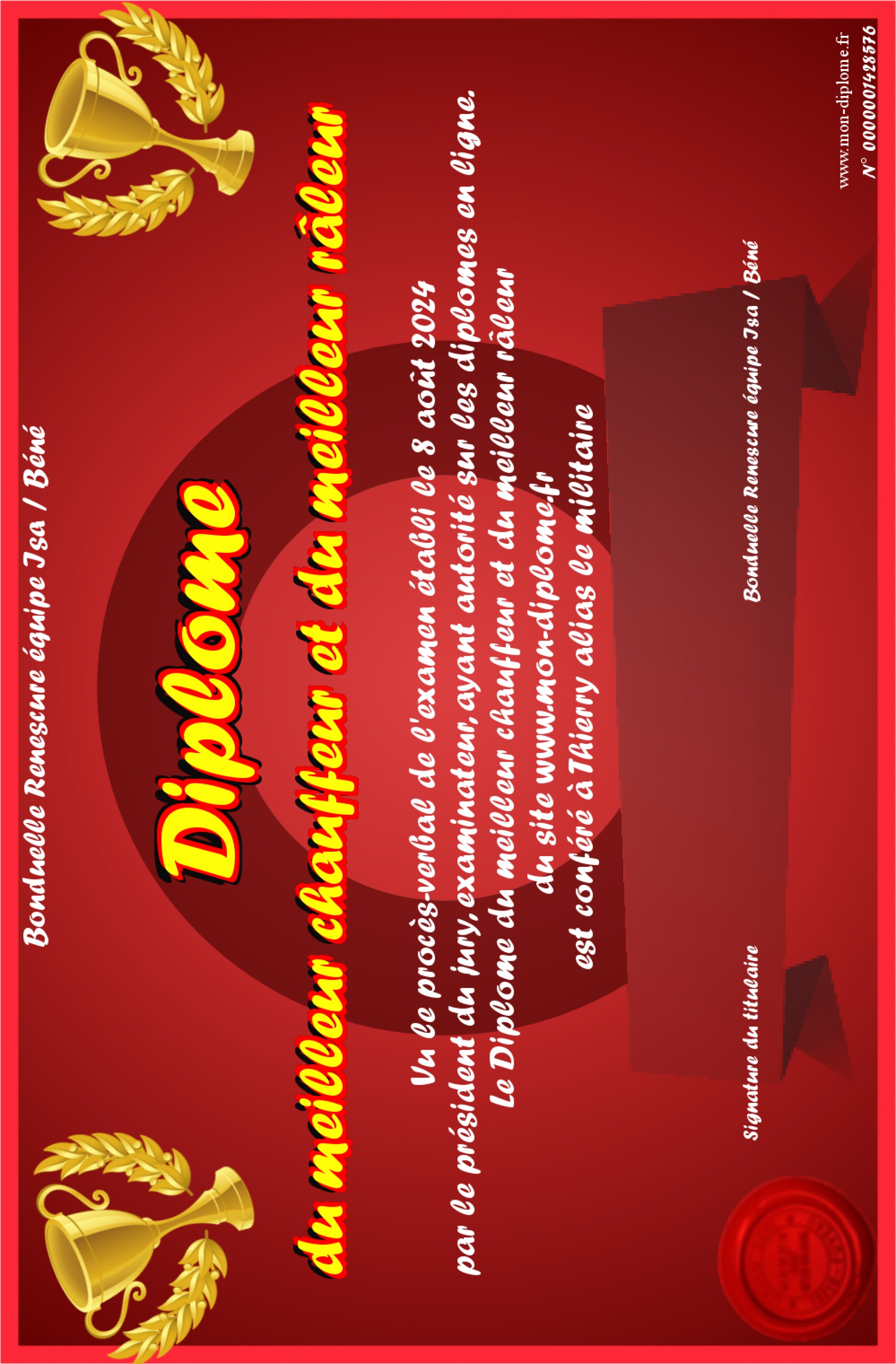 Envoyez par email votre Diplôme du meilleur chauffeur et du meilleur râleur personalisé