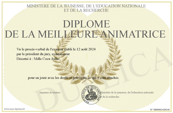 Envoyez par email votre Diplôme de la meilleure animatrice personalisé