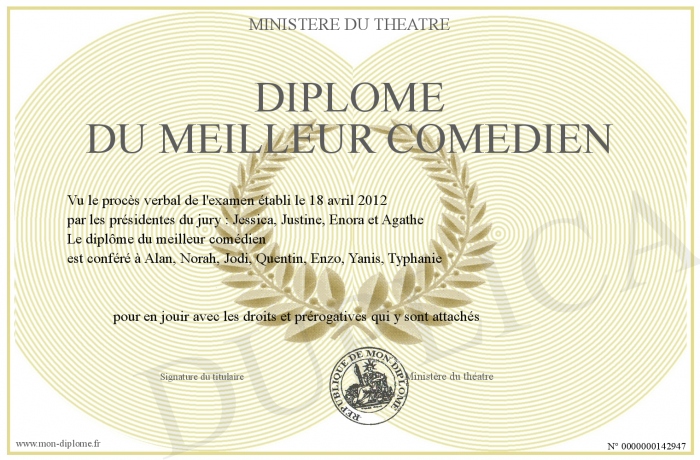 Envoyez par email votre Diplôme du Meilleur Comédien personalisé