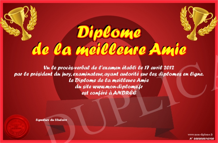 Envoyez par email votre Diplome de la meilleure Amie personalisé