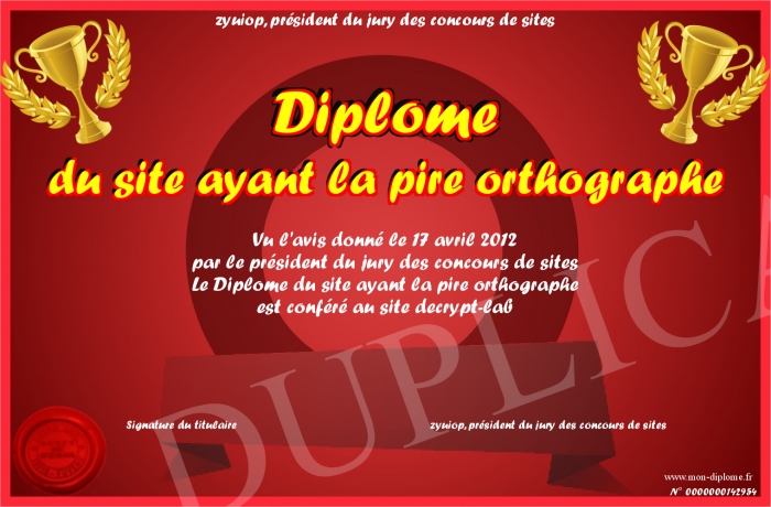 Envoyez par email votre Diplôme du site ayant la pire orthographe personalisé
