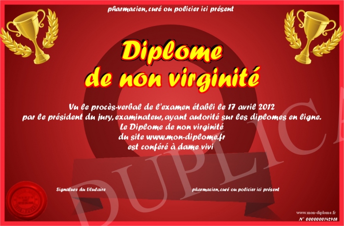 Envoyez par email votre Diplôme de non virginité personalisé