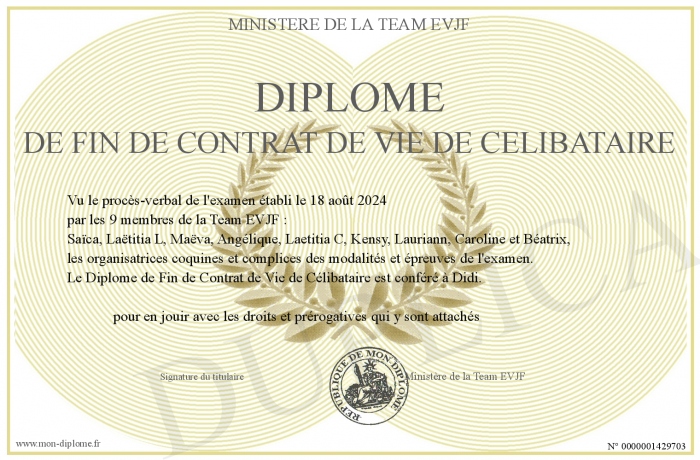 Envoyez par email votre Diplôme de Fin de Contrat de Vie de Célibataire personalisé
