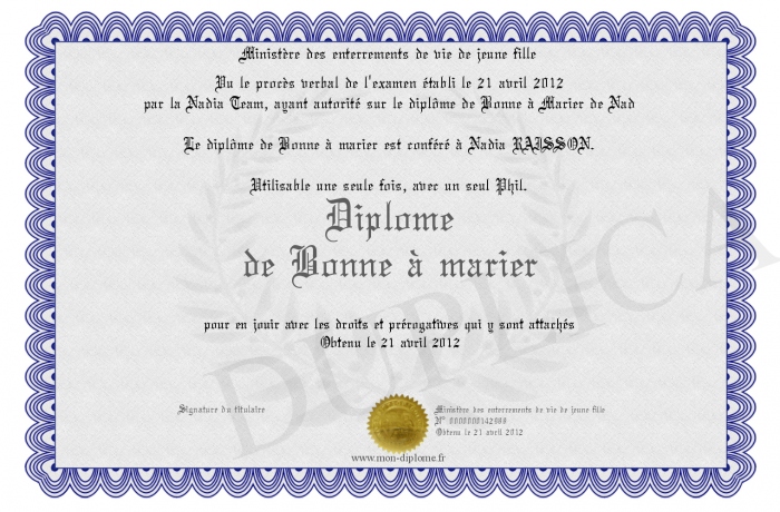 Envoyez par email votre Diplôme de Bonne à marier personalisé