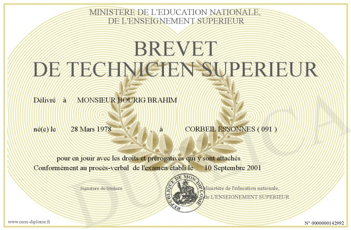 Envoyez par email votre BREVET DE TECHNICIEN SUPERIEUR personalisé