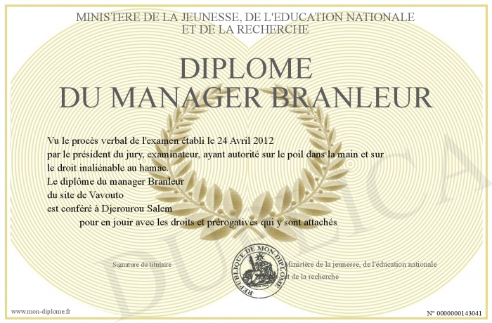 Envoyez par email votre Diplôme du Manager Branleur personalisé