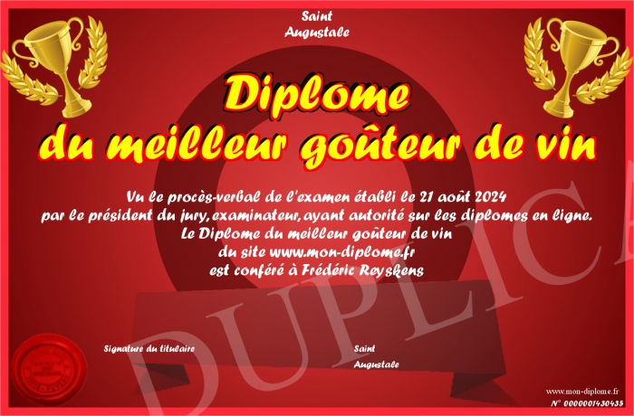 Envoyez par email votre Diplôme du meilleur goûteur de vin personalisé
