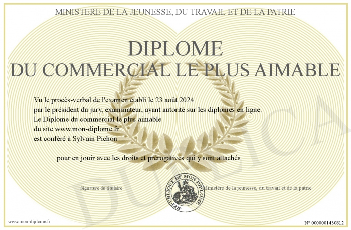 Envoyez par email votre Diplôme du commercial le plus aimable personalisé