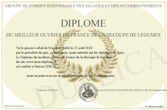 Envoyez par email votre Diplôme du meilleur ouvrier de France de la découpe de légumes personalisé