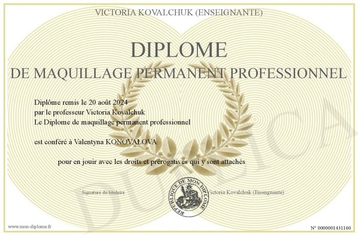 Envoyez par email votre Diplôme de maquillage permanent professionnel personalisé