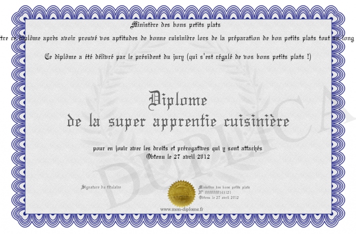 Envoyez par email votre Diplôme de la super apprentie cuisinière personalisé