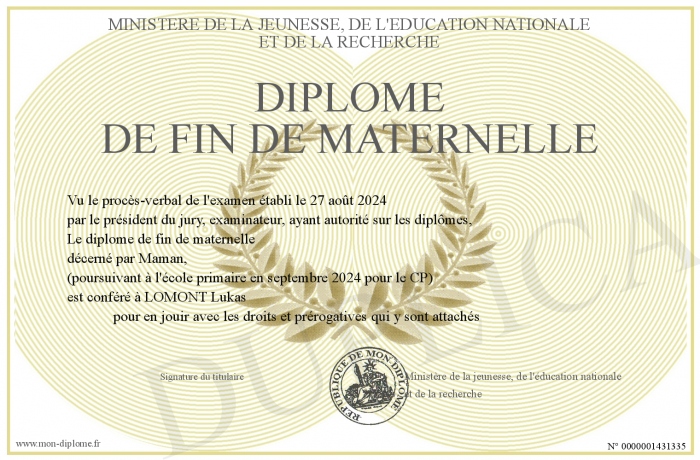 Envoyez par email votre diplôme de fin de maternelle personalisé