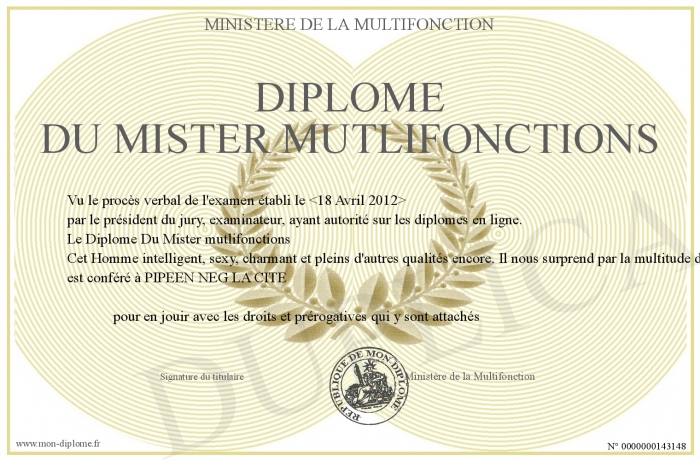 Envoyez par email votre Diplôme Du Mister mutlifonctions personalisé