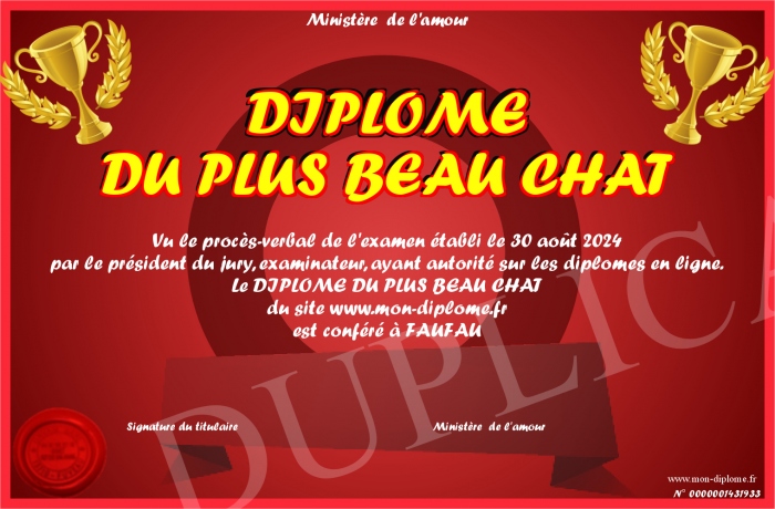 Envoyez par email votre DIPLOME DU PLUS BEAU CHAT personalisé