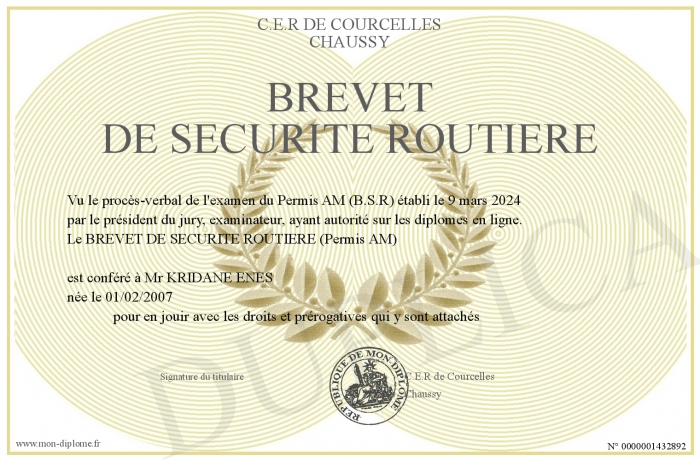 Envoyez par email votre BREVET DE SECURITE ROUTIERE personalisé