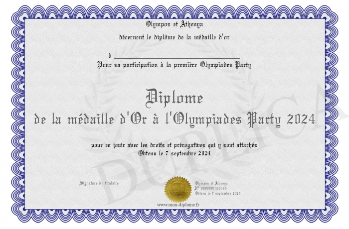 Envoyez par email votre Diplôme de la médaille d'Or à l'Olympiades Party 2024 personalisé