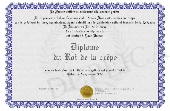Envoyez par email votre Diplôme du Roi de la crêpe personalisé