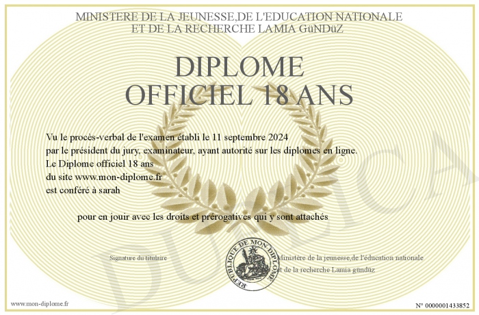 Envoyez par email votre Diplôme officiel 18 ans personalisé