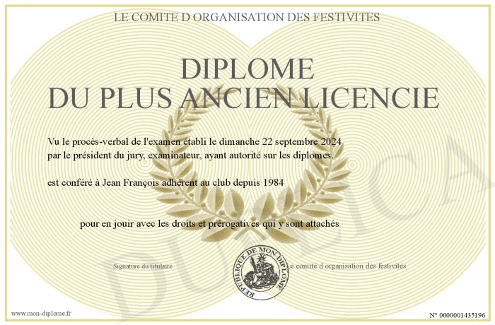 Envoyez par email votre Diplome du plus ancien licencié personalisé
