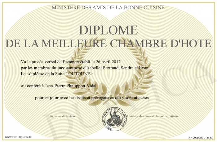 Envoyez par email votre Diplôme de la meilleure chambre d'hôte personalisé