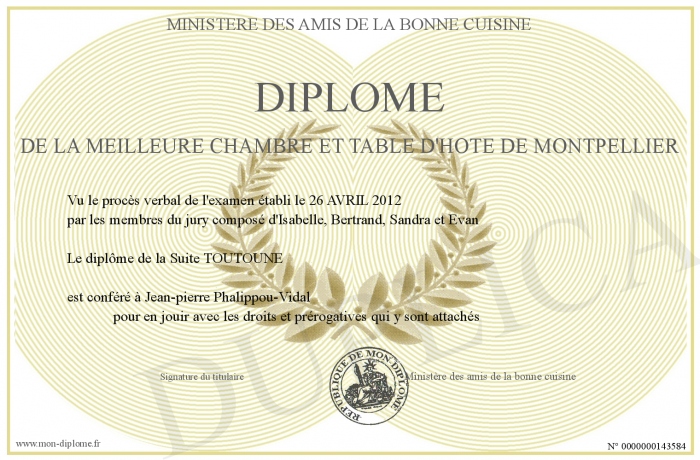 Envoyez par email votre Diplôme de la meilleure chambre et table d'hôte de Montpellier personalisé